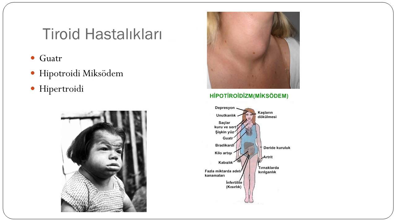 Tiroid bezi ya da tiroid hormonunun işlevlerinde ortaya çıkan sorunlar bir çok hastalığın ortaya çıkmasına neden olabilmektedir. Hipotiroidizm (yetersiz miktarda tiroid hormonu üretimi) ve hipertiroidizm (tiroid hormonunun üretiminde artış) sıklıkla görülen iki sorun olarak kabul edilmektedir. Ayrıca tiroid bezinin bazı nedenlere bağlı olarak normalden daha büyük olması sonucunda guatr hastalığı ortaya çıkmaktadır. Bununla birlikte tiroid nodülleri, tiroid kanseri ve tiroditis yani tiroid bezinin inflamasyonu da görülebilmektedir. Haşimato hastalığı ise, kişinin tiroid bezine karşı bağışıklık sisteminin antikor üretmesi neticesinde ortaya çıkmakta olan otoimmun bir hastalıktır.